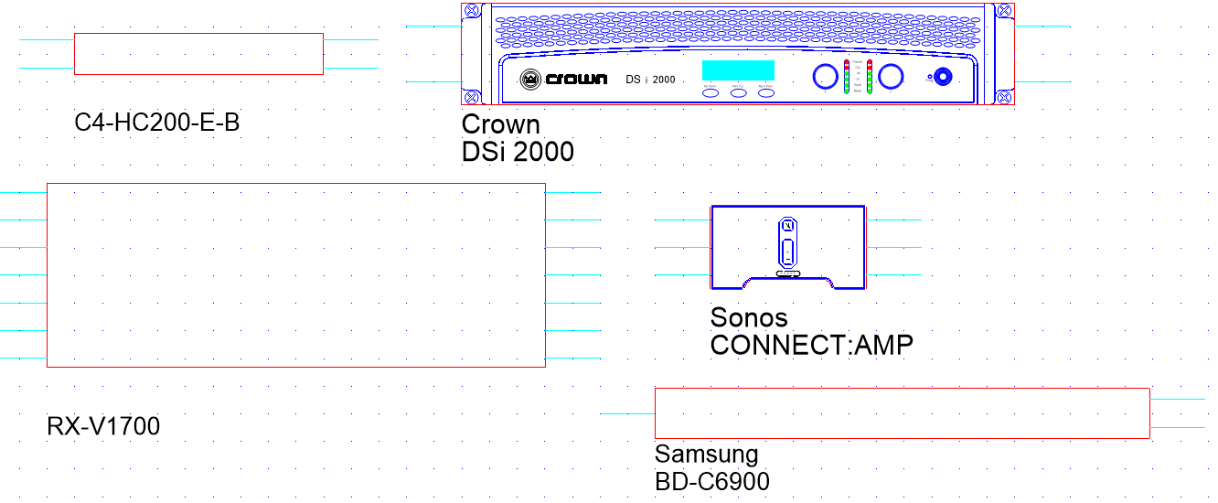 So, after seeing the videos i was very interested in the product becuase of the level of detail the prouct library appeared to have particulary in pictorial view, it looked like i could put a good schematic i could show customers. However once i started using the product i noticed none of the product i chose had any detail at all in both front view and rear view.. so i re-watched the videos and picked a product that was used in the video and it was full of detail as shown in the video. Below is a screen shot of the items i started with. I picked what i thought would be some of the more popular brands Control4, A yamaha reciever, Sonos, Samsung DVD player. As you can see in pictorial view most (except the Crown which was used n the video) have no detail at all.